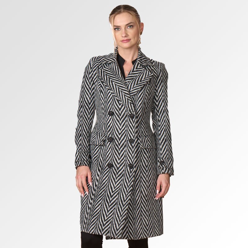 Abrigo cruzado en tonos blanco y negro, con botones al frente y bolsas laterales.