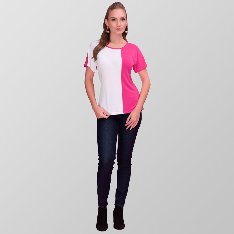 Blusa de manga corta con diseño de bloques de color, dividida verticalmente en blanco y rosa fucsia, con cuello redondo que aporta un toque moderno y vibrante.