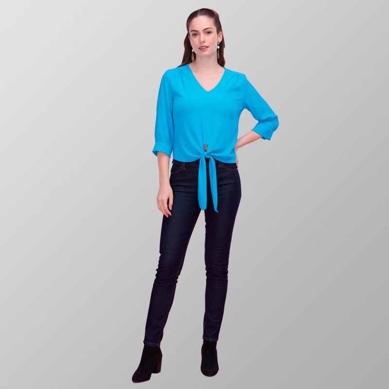 Blusa de manga tres cuartos con escote en V y delicado amarre al frente.