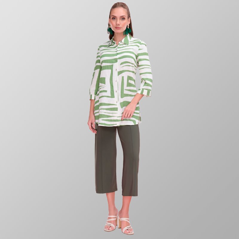 Blusón en tonos blanco y verde, con manga tres cuartos.