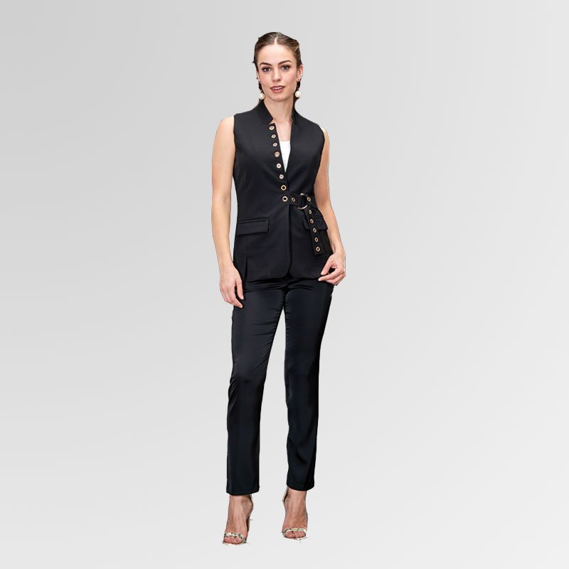 Chaleco largo de vestir con cinturón ajustable en la cintura, corte en cuello en V y bolsas laterales.