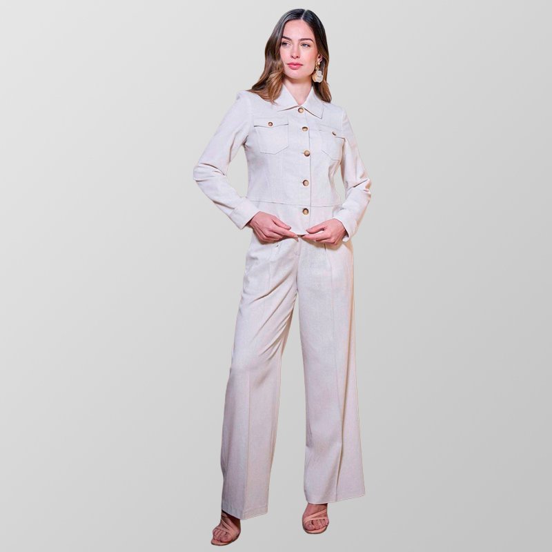 Chaqueta corta tipo saco en elegante tono beige, con diseño estructurado que aporta sofisticación y versatilidad. Cuenta con botones frontales y bolsillos de parche en el pecho que realzan su estilo moderno y funcional, ideal para complementar looks casuales o formales.