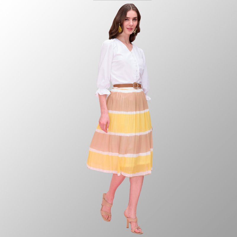 Falda plisada con franjas horizontales en tonos amarillo, beige y blanco, acompañada de cinturón. Ideal para la temporada de primavera por su estilo fresco y versátil.