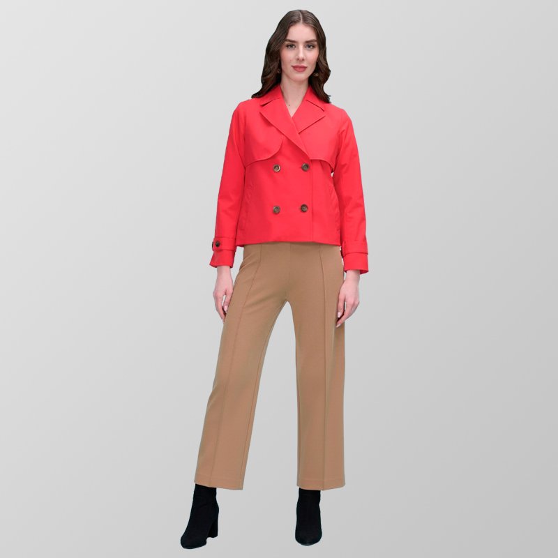 Gabardina corta en dos tonos, con doble botonadura y detalles clásicos como charreteras en los puños. Su corte a la cintura realza la silueta, ideal para un look elegante y atemporal.