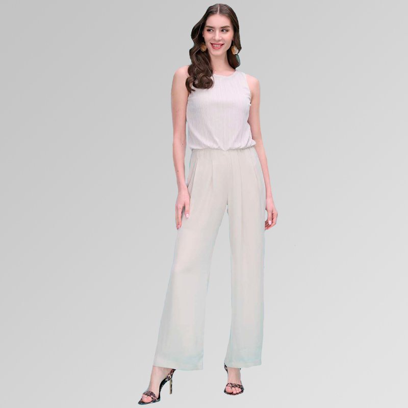 Palazzo en tono claro, sin mangas, con cuello redondo y prácticos bolsillos laterales; ideal para un look fresco y elegante.