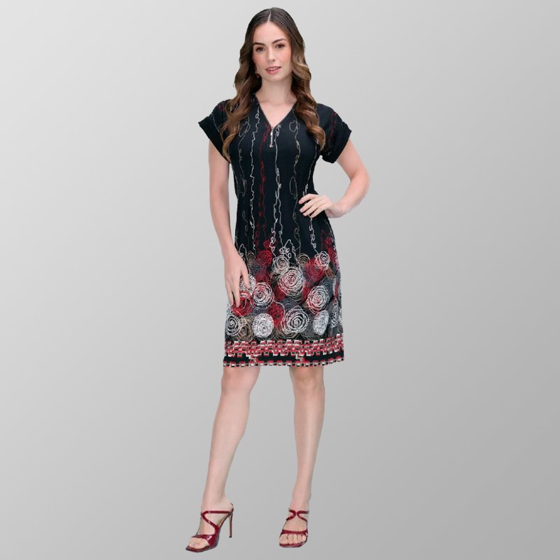 Vestido negro con estampado frontal, cuello en V con cierre y manga corta.