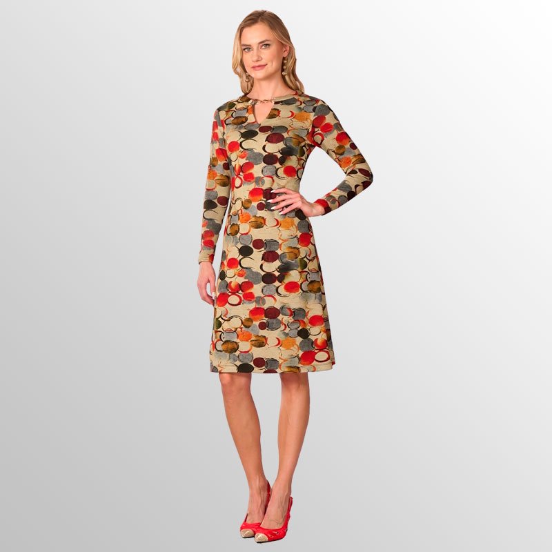 Vestido estampado de manga larga, con largo por debajo de la rodilla. Presenta cuello en corte V y un elegante detalle de broche.