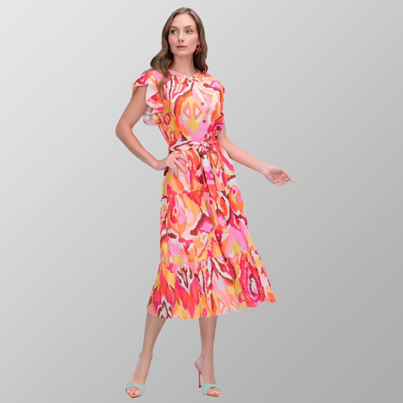 Vestido largo en tonos claros multicolor, con manga corta y botones al frente; incluye amarre en la cintura que define la silueta con un toque fresco y femenino.