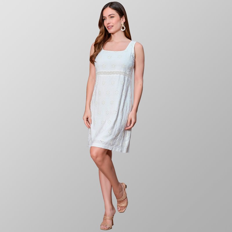 Vestido sin mangas en color blanco, con un delicado patrón de encaje que aporta un toque elegante y femenino. Presenta un favorecedor cuello cuadrado y un largo a la rodilla, ideal para lucir sofisticada en cualquier ocasión.